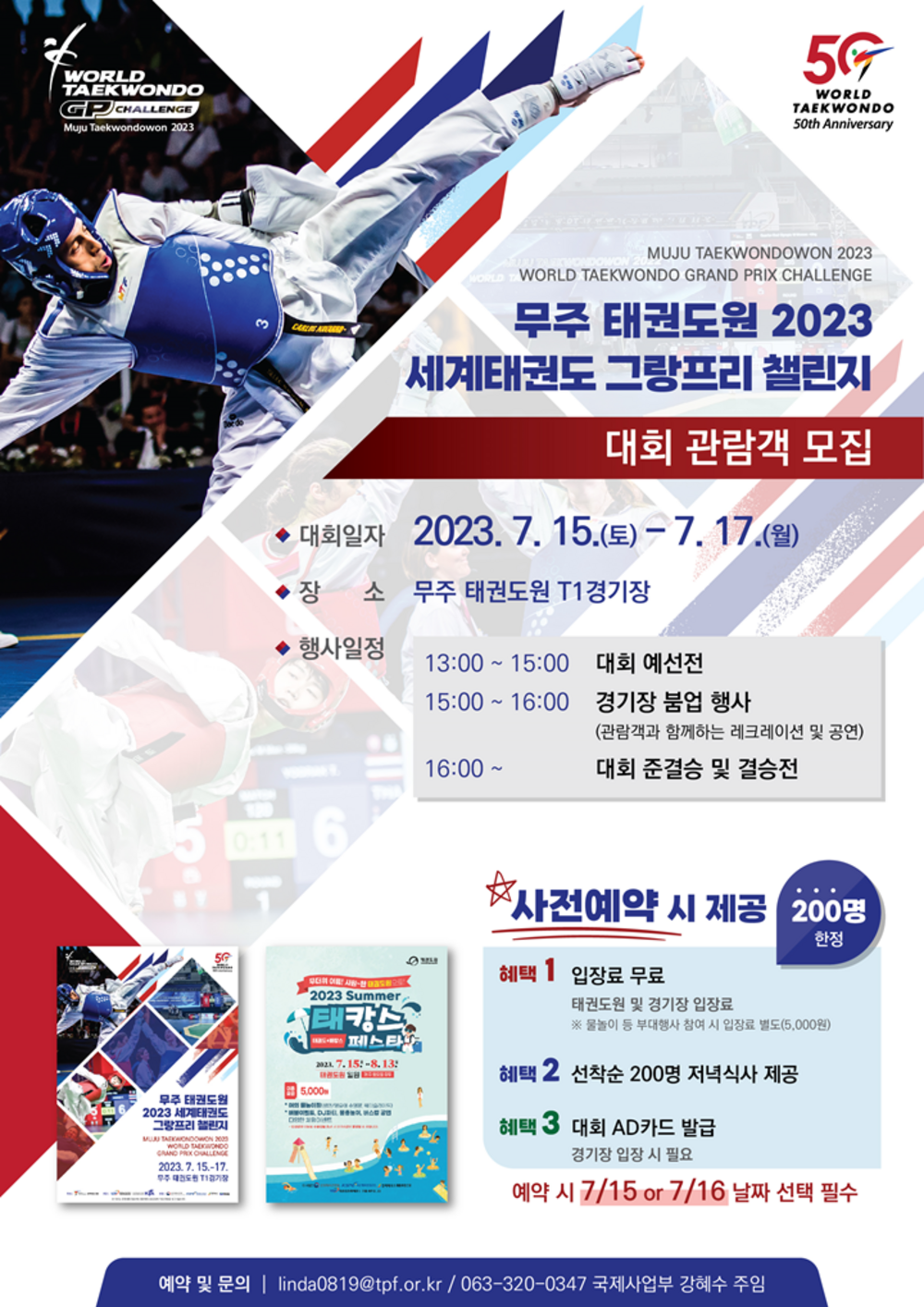 [무주 태권도원 2023 세계태권도 그랑프리 챌린지] 대회가 7.15.(토)부터 3일간 태권도원에서 개최됩니다.