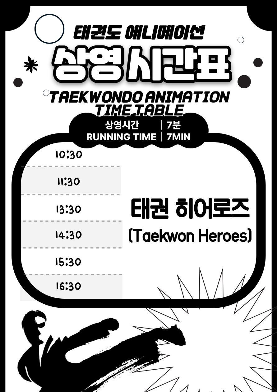 · Screening Frequency: 6 times per day(10:30, 11:30, 13:30, 14:30, 15:30, 16:30) / excluding lunchtime · Screening Location: Theater in the Permanent Exhibition Hall 2 of the National Taekwondo Museum